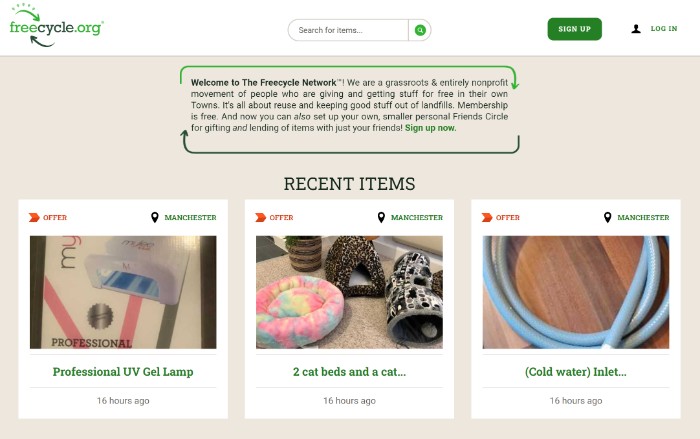 Freecycle is a nonprofit where people can give and get items for free within their towns to keep them out of the landfill. We want to keep items out of the landfill as much as possible (especially things like electronics which can release toxic chemicals into the atmosphere). Who doesn't want free stuff while having positive environmental impacts?