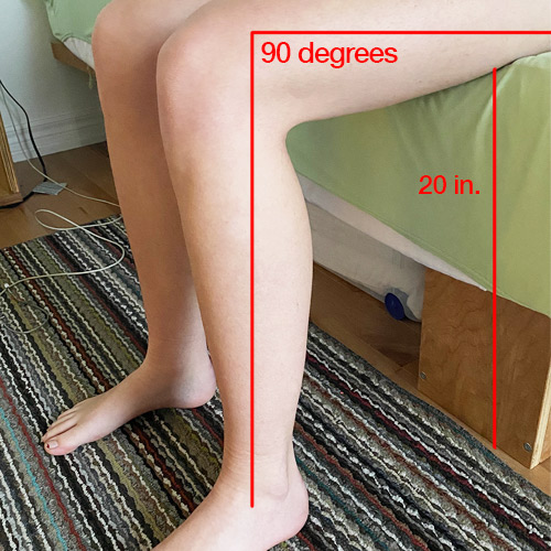 Take a seat on your bed and put your feet flat on the ground. Do your knees go above your hips? Do they go below? If the answer is no and your legs are at a 90 degree angle, then perfect! You nailed it.